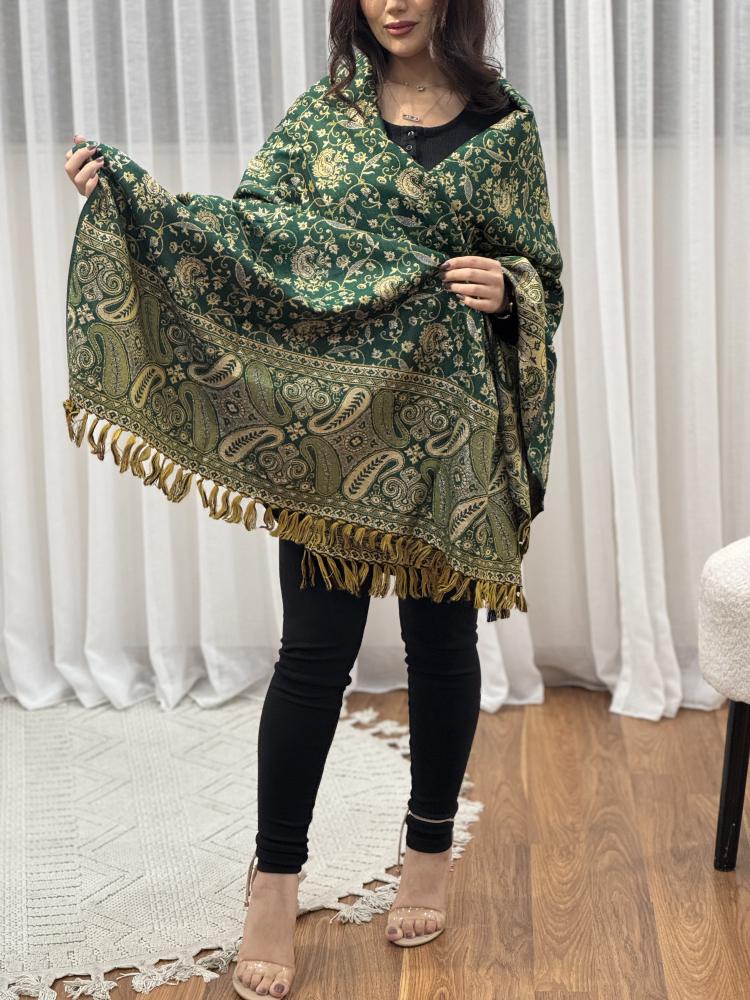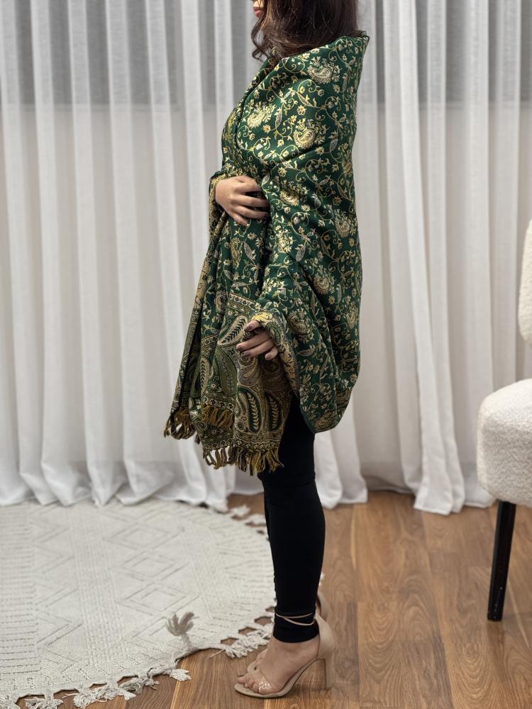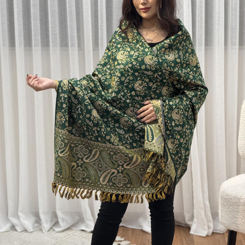 استمتع بالأناقة الفاخرة مع شال كشميري اخضر مزين بخيوط ذهبية من متجر لمسة تطريز. تصميم مستوحى من الزخارف المغولية والفن الكشميري، يمنحك لمسة من التميز والرقي في كل مناسبة.