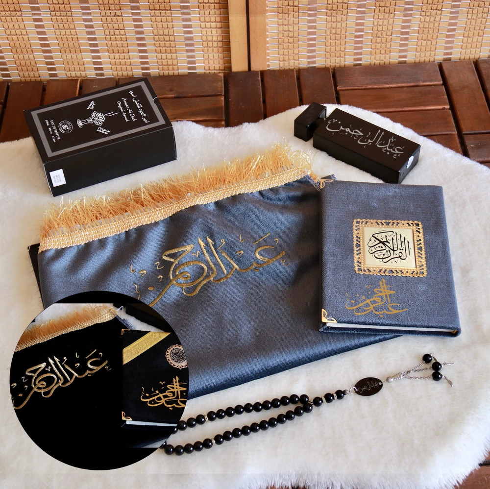 - سجادة صلاة فاخرة مع تطريز الاسم حسب الطلب.