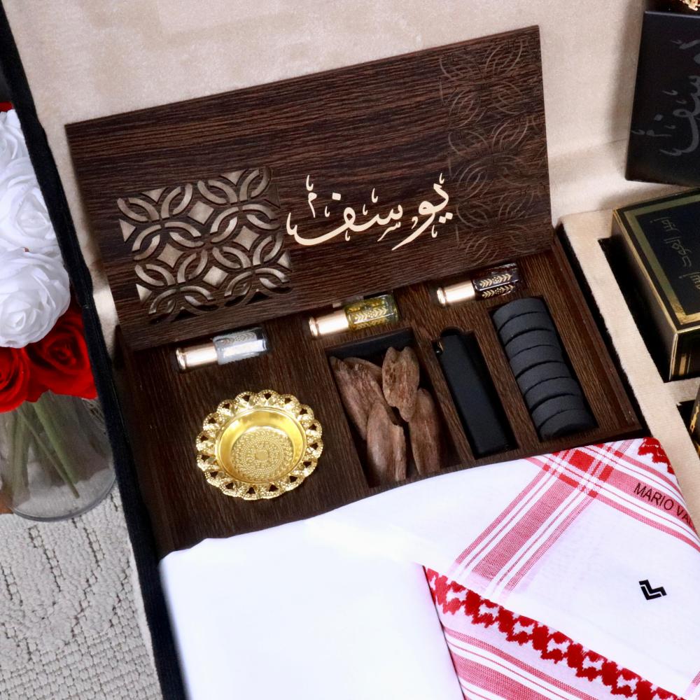 - بوكس البخور والمبخرة الملكي الخشبي (بنحت ليزر): يحتوي على: