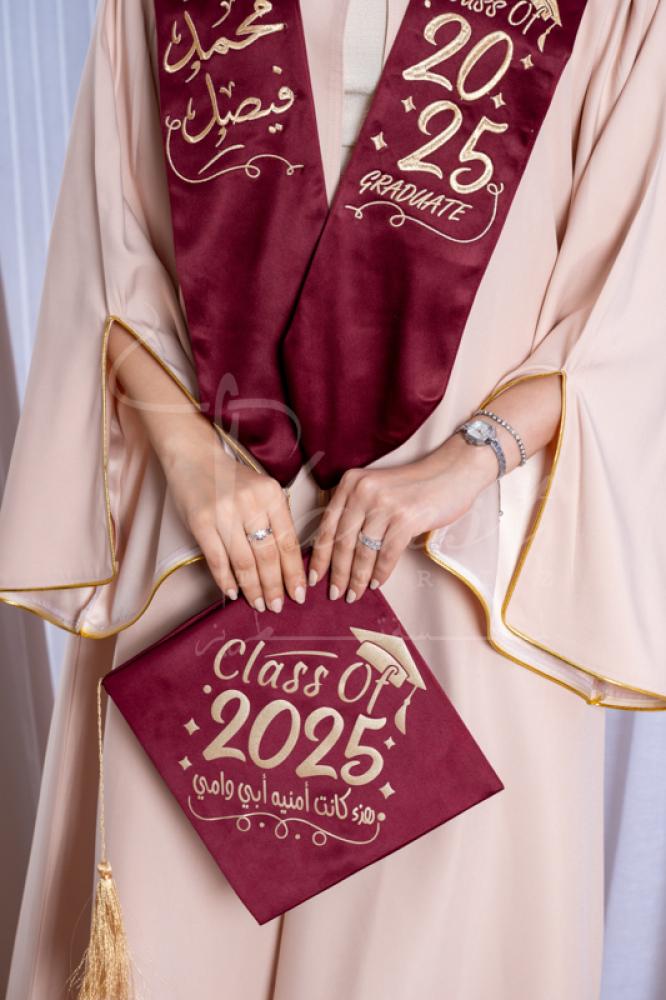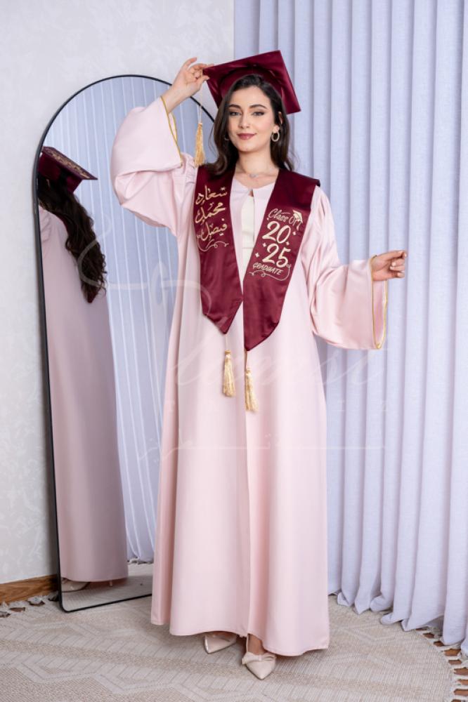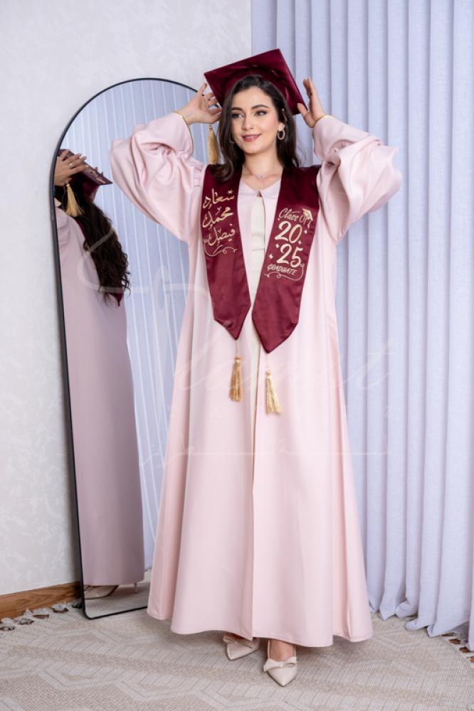 تميّزي بإطلالة أنيقة في يوم التخرج مع روب تخرج بلون لحمي فاتح ووشاح خمري، الخيار المثالي لمن تبحث عن هدايا اونلاين تعبّر عن الذوق الرفيع والتفرد. اجمعي بين الفخامة والراحة بتفصيل دقيق وجودة عالية، وابدئي فصلًا جديدًا من حكايتك بتألق لا يُنسى.