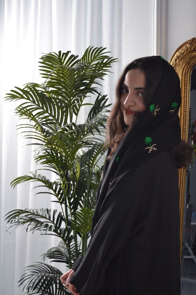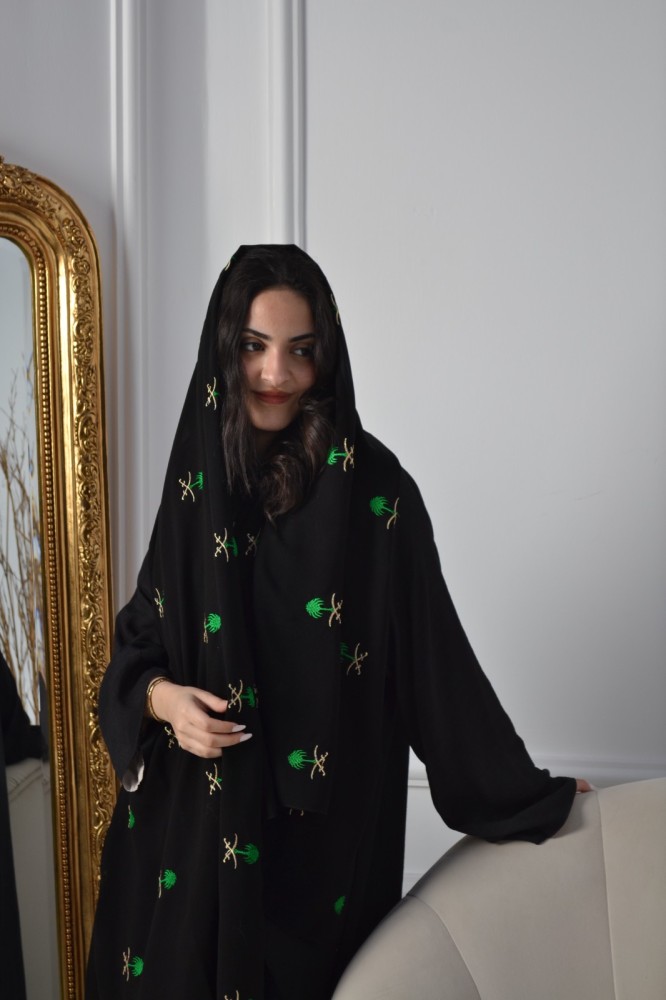 - تطريز فاخر: السيفين والنخلة بتصميم راقٍ باستخدام خيط ياباني ذهبي وأخضر بدقة متناهية.