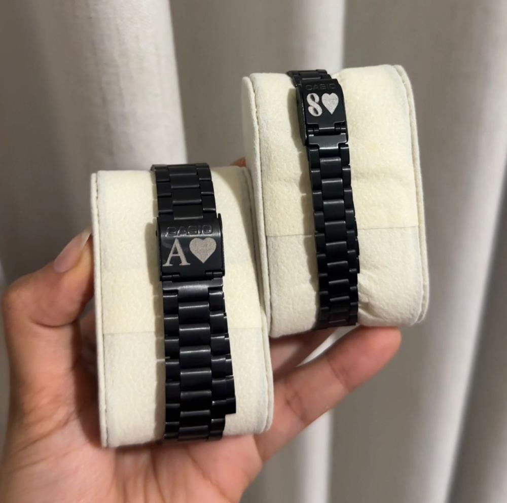 - ساعة رجالية بشكل كاسيو مع نفس الضمان، ونحت اسم وعبارة حسب الطلب.
