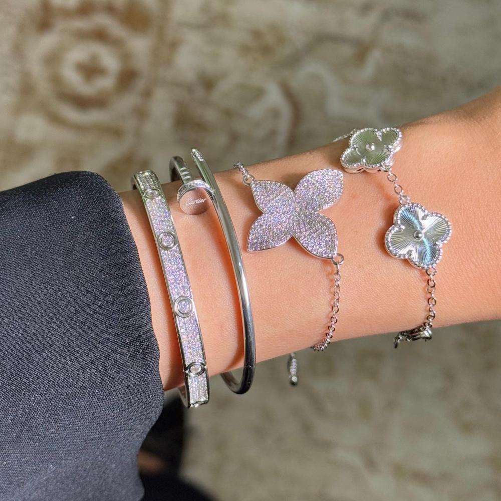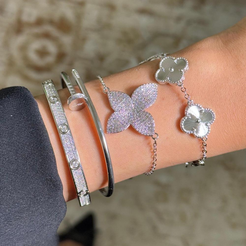 أساور نسائية فضية من لمسة تطريز، باقة مكونة من 4 أساور ترند ومميزة بتصاميم عصرية من فان كليف وكارتير وباسكال، لتمنحك لمسة أنوثة فاخرة.